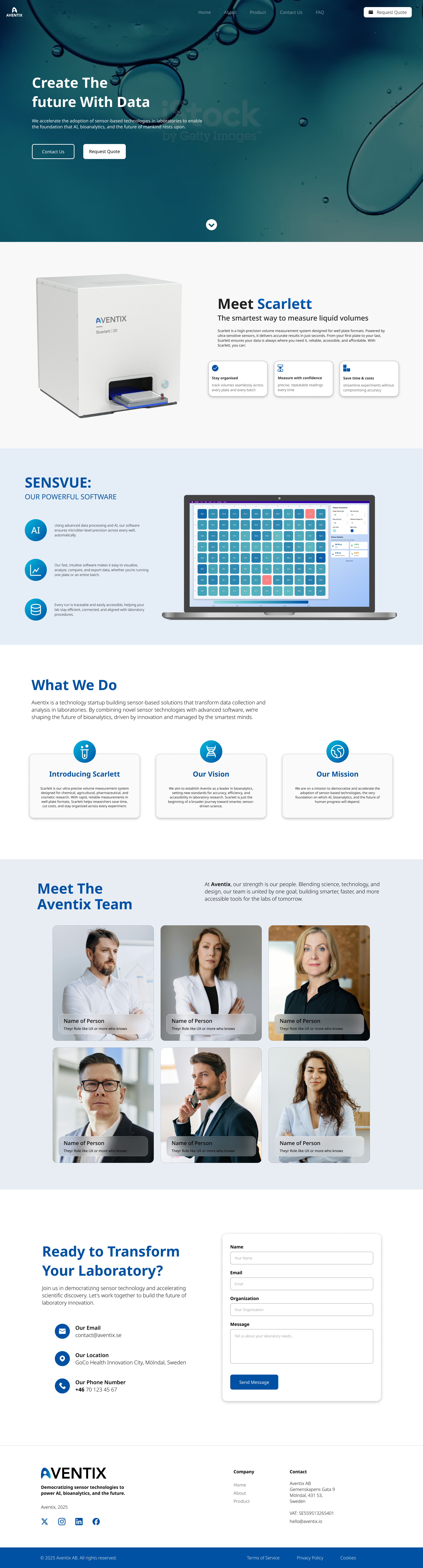 Aventix develops SCARLETT, a high-precision measurement system that helps researchers quickly and reliably measure liquid volumes in laboratory equipment. Used across pharmaceutical, agricultural, cosmetic, and chemical research, SCARLETT reduces manual work and uncertainty, allowing researchers to focus on discovery.